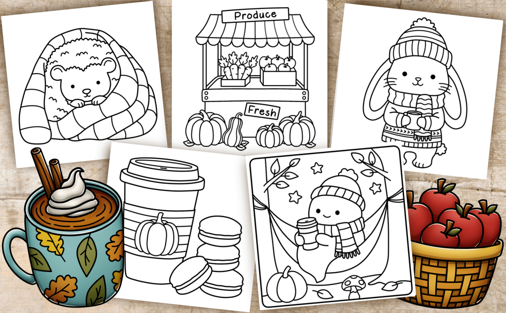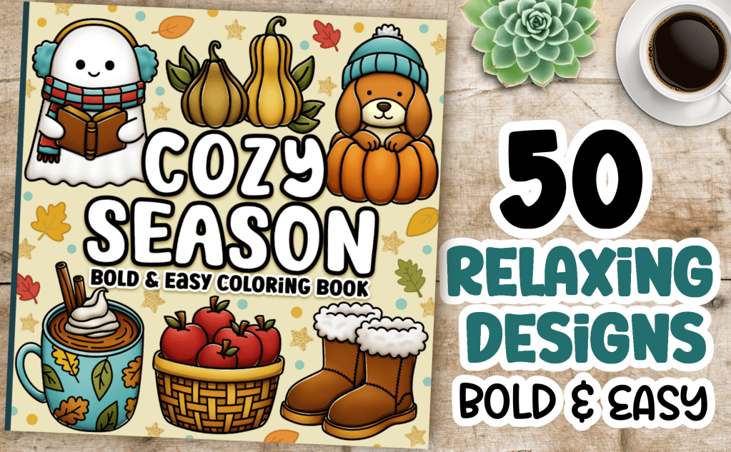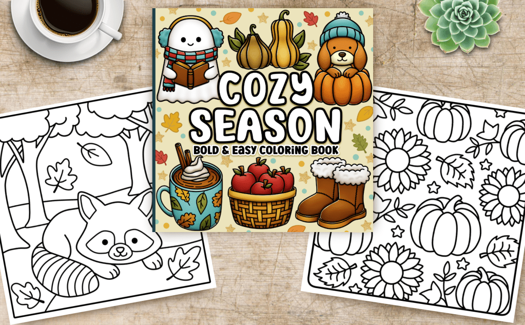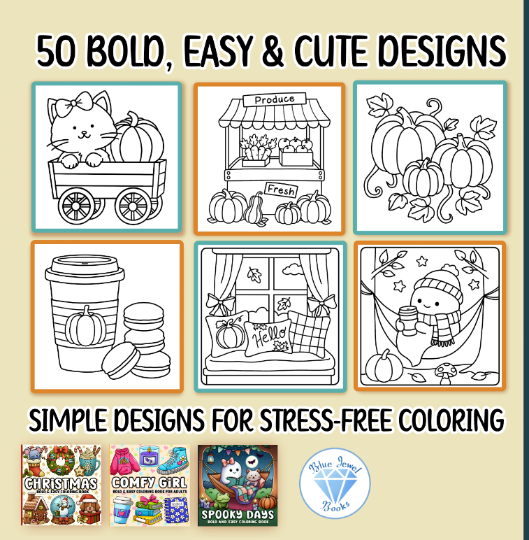 πEmbrace the warmth of Autumn with this beautiful collection of cozy designs featuring adorable woodland animals, pumpkins, falling leaves, landscapes, patterns, buildings, cute clothing, comfort food and more! Pictures have bold, thick lines and easy to color spaces. A fun and relaxing coloring experience for all ages.