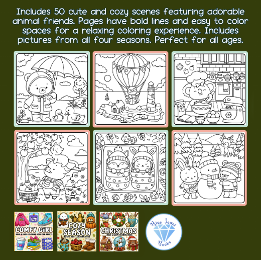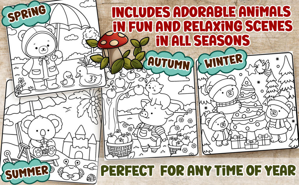 Pages include all four seasons (Spring🌸, Summer🌞, Autumn🍂 and Winter☃️) making this coloring book perfect for year round creativity, fun and relaxation.