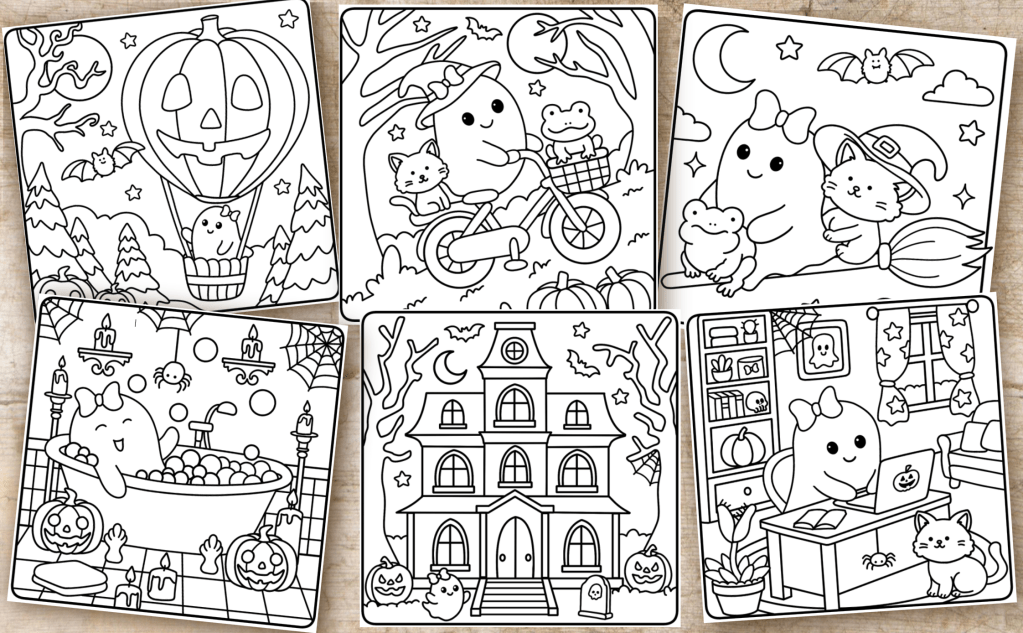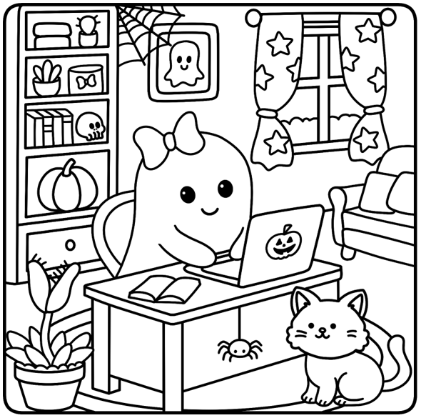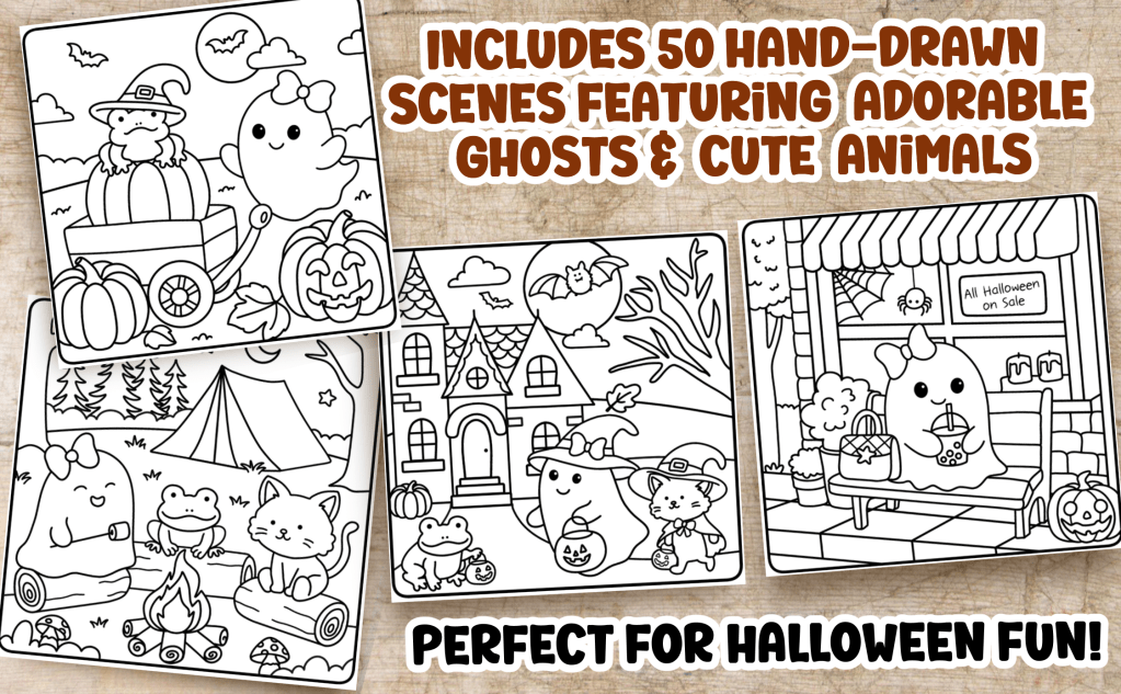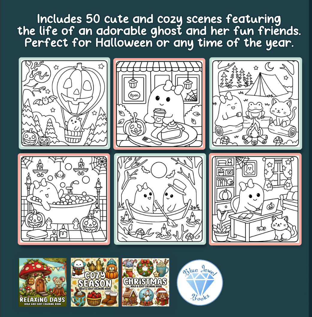 Includes 50 cute and cozy heartwarming scenes featuring the life of an adorable ghost and her cute animal friends. Perfect for Halloween or any time of the year.