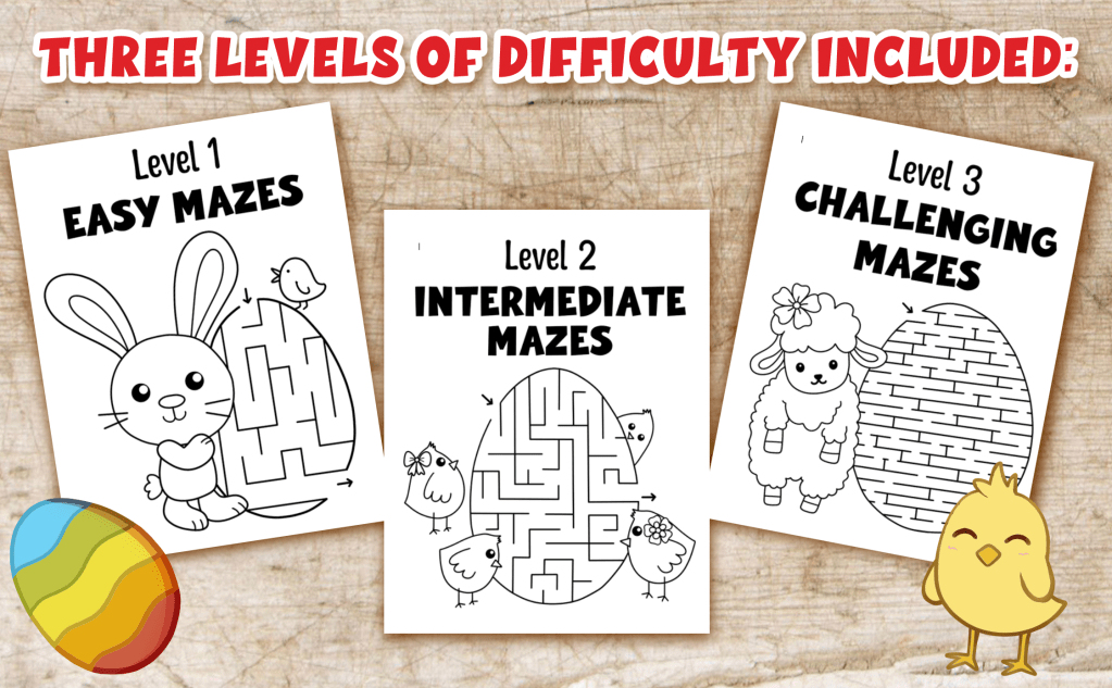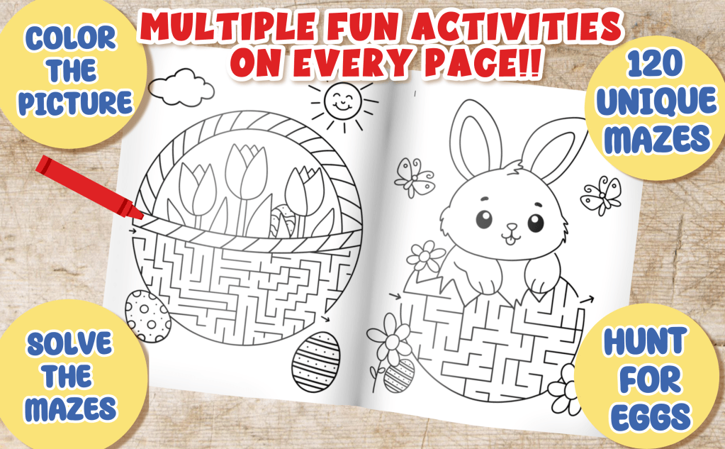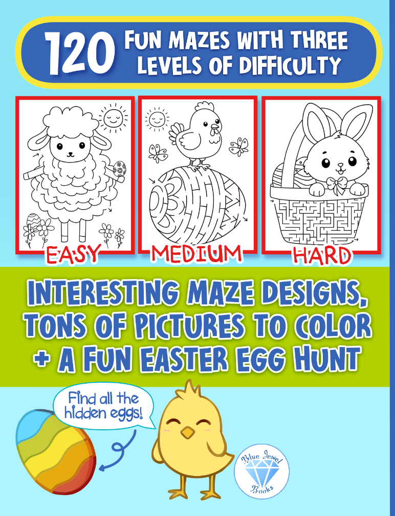 😄Special feature: Easter Egg Hunt! Find and color the Easter eggs hidden amongst the mazes. Allows your child to develop observational skills as well as practice counting.